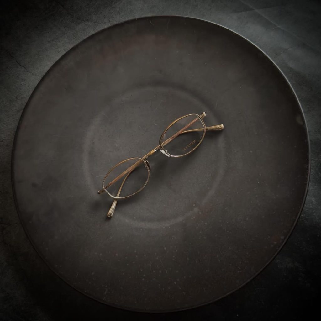 わずかに厚みをもたせたオリジナルリムに丁番の内側にまで装飾が施された職人の手掘りマスターによるヨロイに加えて繊細な模様を刻んだチタンテンプルを組み合わせ、柔らかな曲線を描くブリッジとバレルシェイプのレンズシェイプが素敵です。